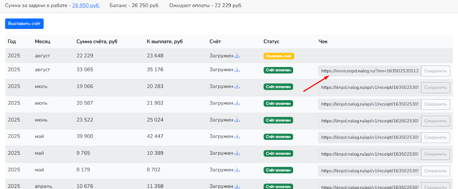 Чек добавляется в профиле исполнителя и отражается в аккаунте бухгалтера