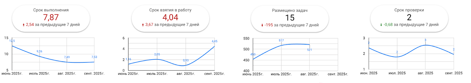 На отдельной панели видно количество размещенных задач за определенный промежуток времени. Можно посмотреть средние сроки статусов.